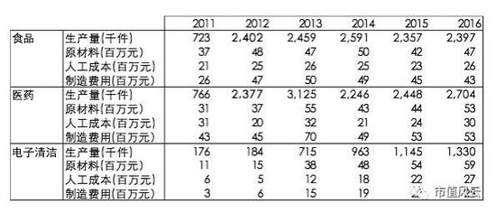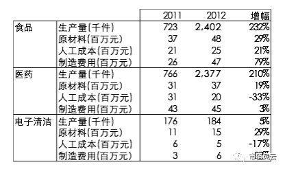 还是以生产量最大的食品和医药类产品为例,食品类产品在产量增长232%的同时,原材料开支却仅仅增长了29%。