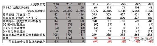 同样,总采购额应当大致等于公司购买商品、接受劳务支付的现金与应付账款、应付票据的增加值之和。2009年到2011年上半年,这一勾稽关系成立,差额以及差额占到“现金支出与当期相关债务增加总和”的比例都较小。但是自2012年开始,这种关系就不再有效。