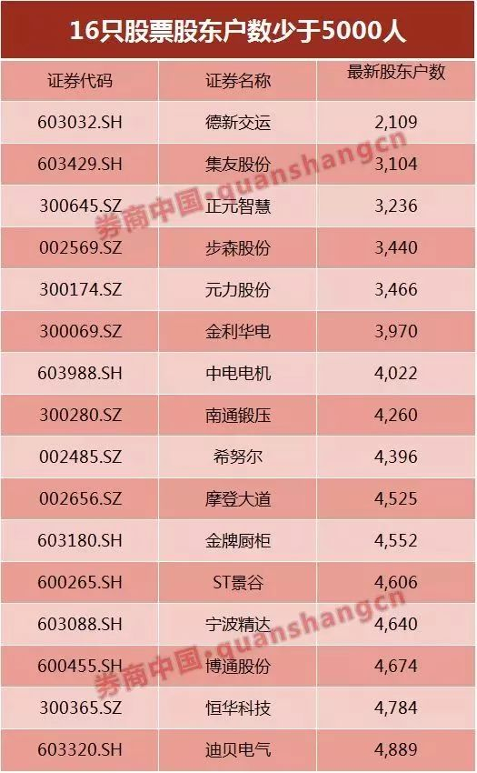 股东户数方面,数据显示,最新股东户数低于5000户的共有16只股票,分别是德新交运、集友股份、正元智慧、步森股份、元力股份、金利华电、中电电机、南通锻压、希努尔、摩登大道、金牌厨柜、ST景谷、宁波精达、博通股份、恒华科技、迪贝电气。