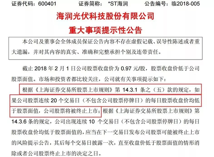 不少投资者对于这一规则惊呼“初次见面”。这一规定与港股市场不同,港股常年有大量低于1元的仙股存在,并无退市一说。2017年预亏28.4亿元(下限)的*ST海润,能否成为A股史上第一只因股价连续20个交易不足1元而退市的股票,成为市场关注的焦点。