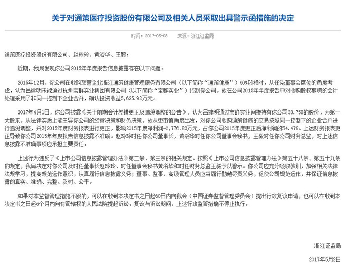 在吕建明董事长的回应文章发布之后,我们对面包财经原文所提及的核心事实进行了复查,该等信息均有充足的证据。比如:通策医疗被监管部门出具警示函,有浙江证监局公开发布的处罚决定为证。
