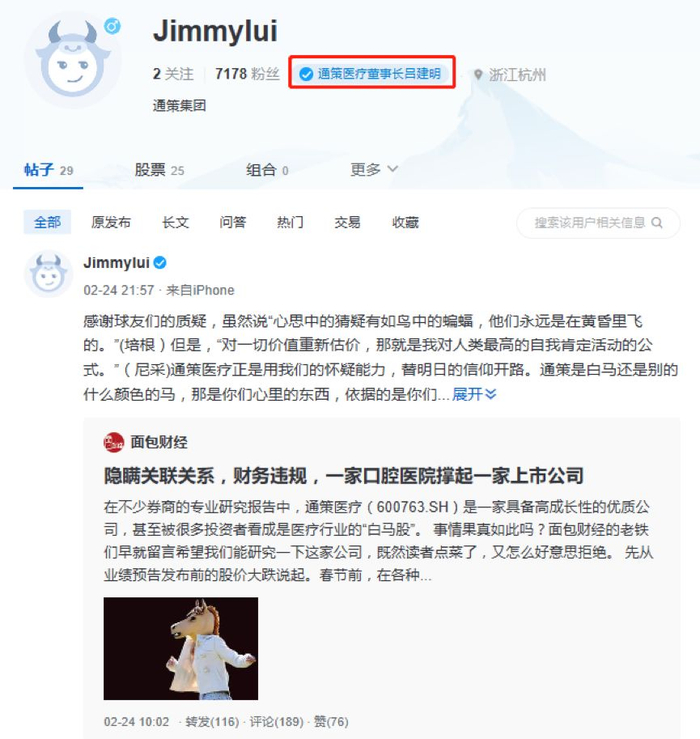 当日,在著名投资者社区雪球上,一名认证身份为“通策医疗董事长吕建明”的用户,发布了总字数超过2500字的长篇文章,对面包财经的内容进行了回应甚至是反驳。