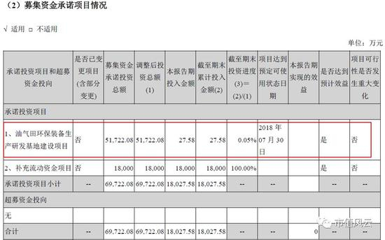 风云君注意到,公司2016年非公开发行股份募集7亿元主要用于油气田环保装备生产研发基地建设项目,原计划到2018年7月30日完成。截止2016年年底,项目进度为0.05%;2017年上半年,公司累计投入资金仅为约4900万元,项目进度为7%。