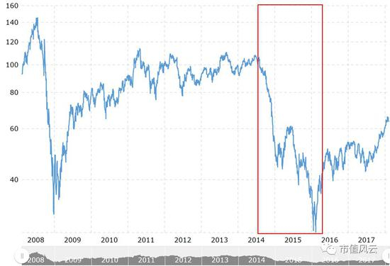 WTI原油历史价格走势,来源:macrotrends.net