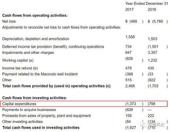 看完这项,我们再来关注最重要的栏目——资本开支。这体现了客户对未来的预判,也是会直接反应在采购端的子项目。哈里伯顿2017年资本开支(未经审计)达到13.73亿美元,而2016年同期则是7.98亿美元,增长72%。