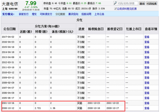 大唐电信最近的一次分红要追溯到2001年,距今已经超过16年。