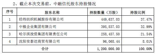 野马财经(微信公号:ymcj8686)注意到,截止本次交易前,中融信托的持股比例为经纬纺机持股37.47%、中植集团持股32.99%、哈投资持股21.54%和沈阳安泰达持股8.01%。