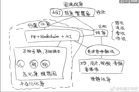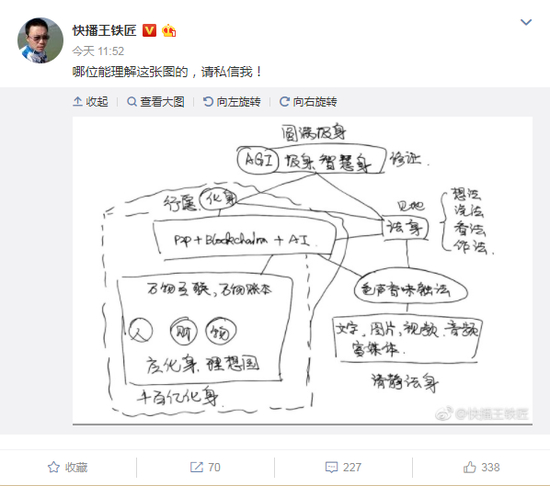 快播王欣于今日在微博发布图片,并配文“哪位能理解这张图的,请私信我!”图片中有“Blockchain”(区块链)、“P2P”、“AI”等字眼,或许王欣准备入局区块链,正积极招募相关人才。