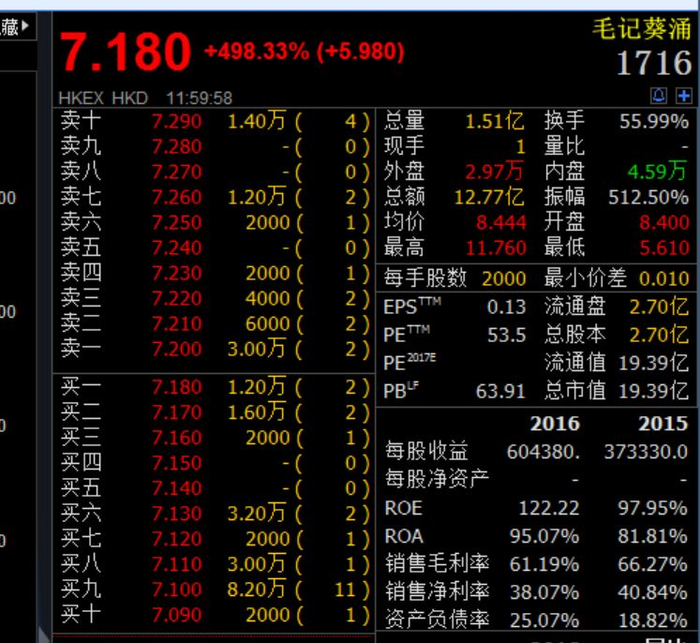 毛记葵涌(1716.HK)今日挂牌上市,开盘大涨600%,报8.4港元,成交额2.03亿港元。其最高涨至11.76港元,截至中午收盘,毛记葵涌报7.18元,涨幅498.33%。
