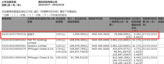 据港交所披露的文件,腾讯控股总裁刘炽平3月27日以平均每股434.3624港元的价格减持100万股腾讯股份,价值约4.34亿港元,折合人民币3.48亿元,减持后刘炽平持股腾讯0.48%。