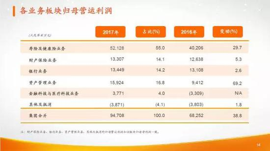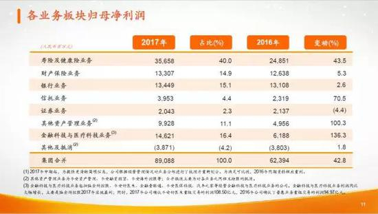 从利润的角度来看,更能看到保险业务板块在中国平安的核心地位。2017年,保险业务板块合计贡献了54.9%的归属于母公司股东的净利润。