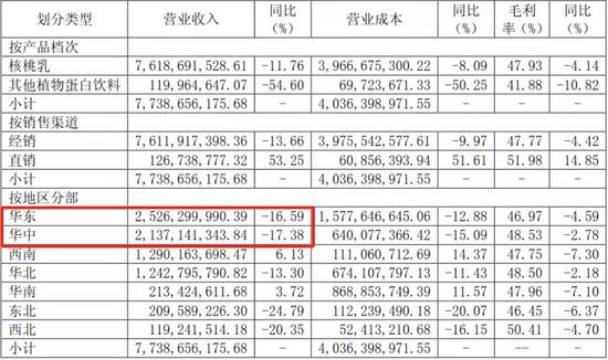 斑马消费在分析其年报之后发现,在公司7个营销区域中,5个区域均同比呈两位数降幅,仅有两个区域微增。10亿级以上的4个区域中,3个下降幅度明显,仅华东和华中两个区域就流失了近10亿销售收入。