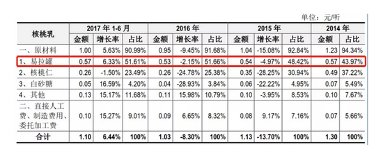 在这两项主要成本中,核桃仁的采购价格逐年下降,易拉罐的价格在2017年止跌回升,2017年上半年比2016年上涨了5.87%。