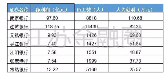 江苏7家上市银行中,南京银行人均创利最高,不过才刚刚超过110万元,最少的常熟银行,人均净利润仅有25.57万元。