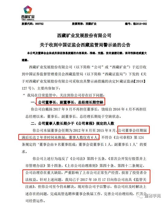 4月9日晚间,西藏矿业收到了西藏监管局的警示函,监管层认为西藏矿业在公司治理上存在重大缺陷,严重影响了上市公司正常生产经营,损害了投资者合法权益。原因就是公司长期没有董事长、总经理和副董事长。