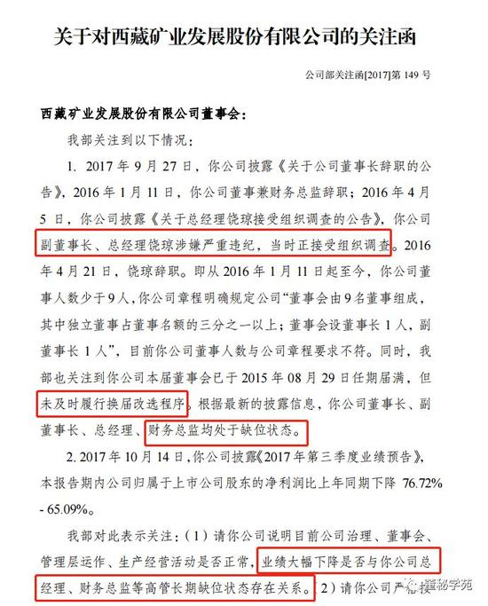 据监管层的警示函,西藏矿业自戴扬2017年9月不再担任董事长,饶琼自2016年 4月不再担任总经理以来,董事长、副董事长、总经理长期处于空缺状态。
