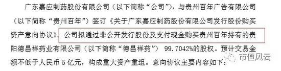 2018年2月21日晚间发布《关于筹划重大资产重组的停牌公告》,公告称,嘉应制药与贵州百年广告有限公司签订资产购买意向协议。上市公司拟通过非公开发行股份以及支付现金购买贵州百年持有的贵阳德昌祥药业有限公司99.7042%的股权,预计交易金额不低于5亿元。