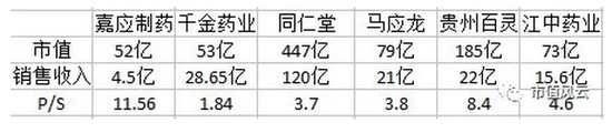 我们根据德昌祥药业官网对产品的介绍,列出了以下几个与德昌祥药业生产产品相似的上市公司,并计算其市销率。