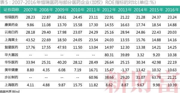 尽管如此,恒瑞医药ROE的表现却不如其销售毛利率指标坚挺。2007年以来,恒瑞医药的ROE一直高居21%以上。虽说在整个药企阵营中也比较靠前,但与华东医药(000963)、步长制药仍然存在明显的差距(表5),华东医药的ROE最高之时超过恒瑞医药近20个百分点,步长制药的ROE最多时超过恒瑞医药近40个百分点。