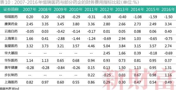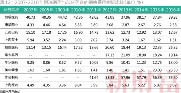 销售费用的特点与管理费用相同(表12)。2007年以来,恒瑞医药的销售费用率占比呈现逐步下降的趋势,介于37.84%-40.73%,显著高于多数企业,仅低于步长制药。除云南白药、复星医药、步长制药、华大基因之外,医药企业的销售费用率多介于1%-6%。