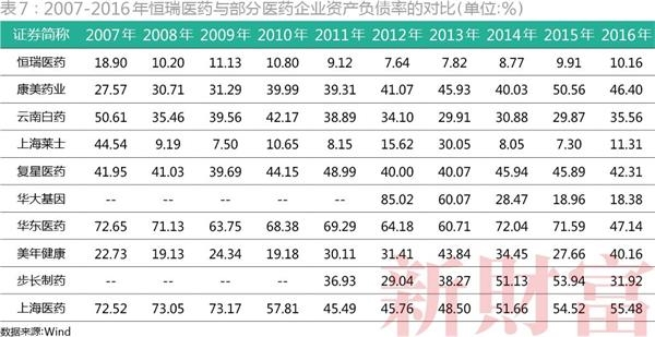 表7显示,医药企业的资产负债率普遍不高。2008-2016年,恒瑞医药的资产负债率均低于10.8%。在10家药企中为数最低,仅有上海莱士与之相近,行业较低资产负债率的美年健康、步长制药、云南白药也在30%左右。
