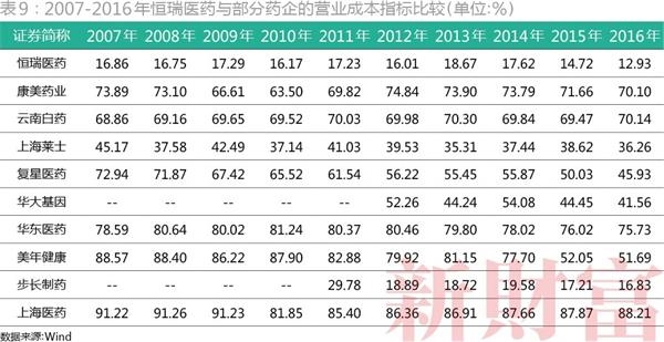 从营业总成本看,恒瑞医药呈逐年略减的趋势,这与全行业多数企业大致相仿(表8)。总的来看,恒瑞医药的营业总成本比偏低,介于77%-81.28%之间,与康美药业、云南白药、华大基因、步长制药等较为接近。仅有上海莱士1家药企同项指标明显低于该水平,介于51.88%-67.15%之间。恒瑞医药的低营业总成本,与前文呈现的高利润率总体保持一致。