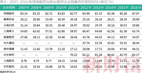 选取西药、中药、生物制品以及保健品等领域的10家医药公司,对比其利润数据粗略可见,中国医药行业的“暴利”比比皆是(表4)。如,步长制药(603858)的销售毛利率一直稳居80%以上;上海莱士(002252)的销售毛利率常年在60%以上;华大基因的同项指标也多年位居50%之上。但相较于恒瑞医药,前述三者相形见拙。2007年以来,恒瑞医药的销售毛利率连年高于81%,最高达到87.07%,已然是中国毛利率最高的医药企业。