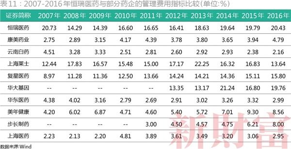 管理费用数据显示(表11),恒瑞医药的该项指标均显著高于同行。2008-2016年,恒瑞医药的管理费用从14.29%平稳上升至20.43%,上升趋势颇为明显,在同行业几乎无匹敌者。尽管上海莱士、复星医药、华大基因的同期指标与恒瑞医药较为接近,但多数的医药企业管理费用率均在10%以下。