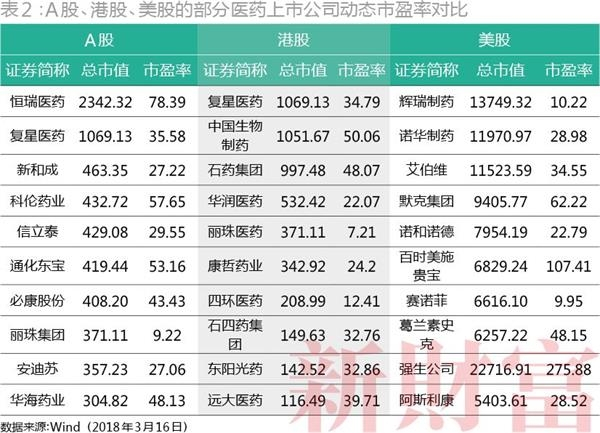 我们再考察一下境外资本市场的医药板块市盈率情况(表2)。与A股对比,港股医药板块的估值总体偏低。港股创新药龙头中国生物制药(01177.HK)市盈率为50.06倍,在港股市场遥遥领先,但与恒瑞医药相比,却相形见绌。数据显示,同时在港股、A股上市的复星医药(600196,02196.HK),在两地市场的市盈率分别为34.79和35.58倍,大致相当,但港股市场略低。港股公司丽珠医药(01513.HK)与丽珠集团(000513)实为在深港两地上市的同一间公司,在港深两地的市盈率分别为7.21和9.22倍,与复星医药异曲同工。
