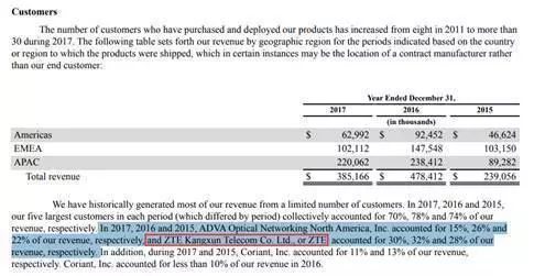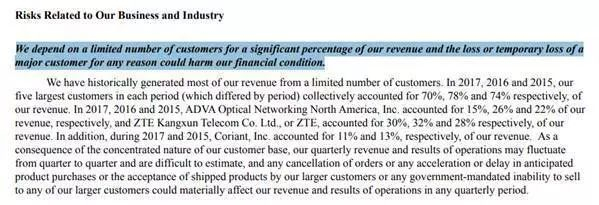 每日经济新闻(微信号:nbdnews)记者还注意到,在ACIA在2017年年报中,公司还在“与我们的业务和行业相关的风险”一栏中明确提到了对中兴通讯的依赖性:“我们的收入很大一部分依赖于少数几家客户,由于任何原因导致公司损失或者暂时损失一名主要的客户,都会对我们的财务状况产生重大影响。”