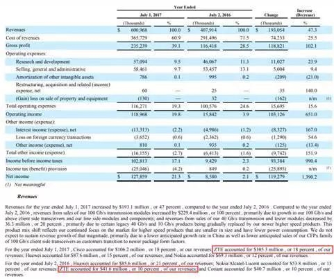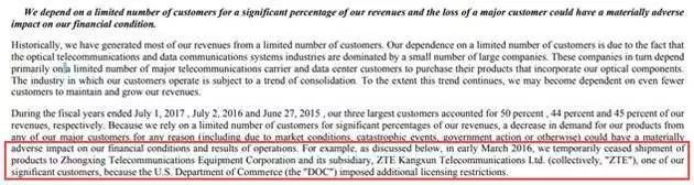 与ACIA类似,Oclaro Inc.也在其2017年报中的风险提示一拦中明确提及,“我们的收入很大一部分依赖于数量有限的客户,而主要客户的流失可能会对我们的财务状况产生重大的不利影响。例如,因为美国商务部实施了额外的许可限制,我们曾在2016年3月初暂时停止向中兴通讯发货。”