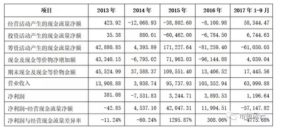 上表可以看出,2014-2016年,连续三年经营活动产生的现金流量净额为负数,经营活动产生的现金流量远低于净利润,虽然收入连年增长,而净利润与经营现金流量差异率连续三年均在60%以上,营收转化为现金流量的质量惨不忍睹。