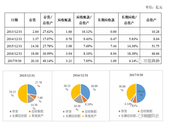 通过上述对比图表可知,从2013年至2016年期间,存货、应收账项除2014年较上年有所减少外,一直呈增长趋势,2015年存货、应收款项合计数已占当年总资产的49.85%,2016年达到63.47%,其中当年存货占比为36.99%,而截至2017年9月30日,存货已占去总资产的一半,达到20.10亿元。
