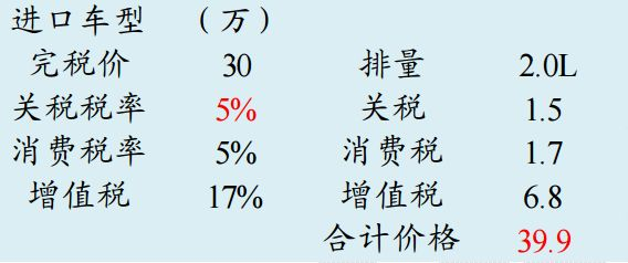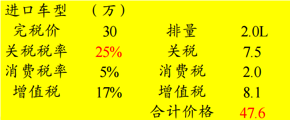以下为一辆完税价格为30万元的进口汽车,关税从25%降低到5%之后的价差。