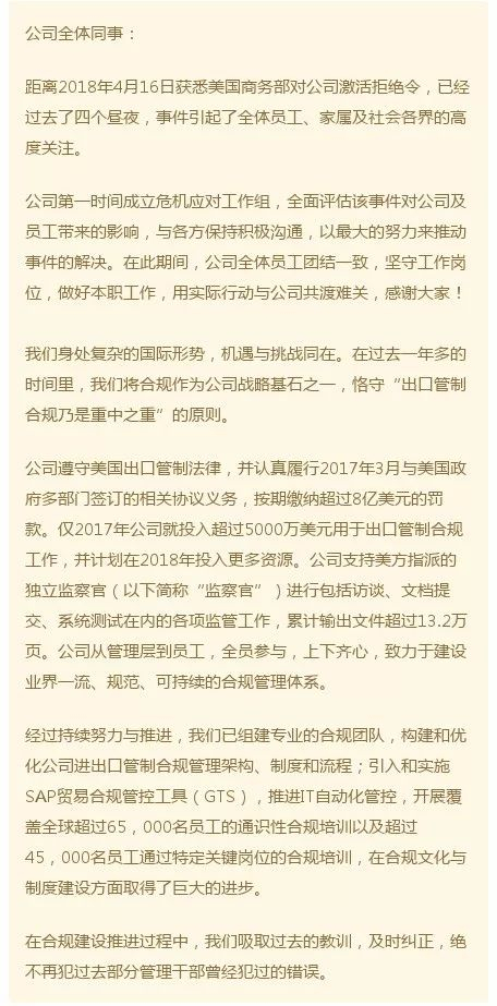 4月20日,中兴通讯董事长殷一民还发了内部信,公开了美国制裁中兴事件全过程。