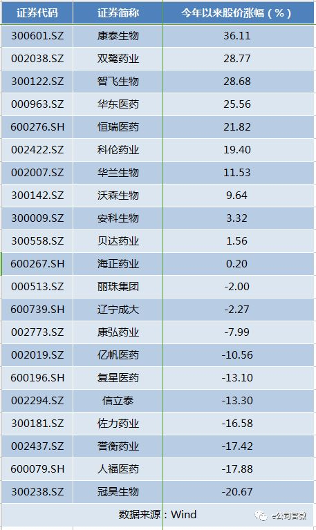 从个股来看,自今年一月份以来,股价涨幅最为领先的是康泰生物(36.11%),其次是双鹭药业(28.77%)、智飞生物(28.68%)、华东医药(25.56%)和恒瑞医药(21.82%)。
