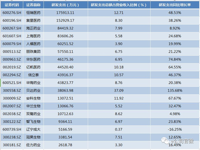 研发投入同比增长74.84%排第二位的华东医药则预计2018年度研发费用的支出在2017 年度的基础上将增长30%以上,公司将加快新产品研发工作进度,新产品研发费用和技术引进的投入将会进一步加大。