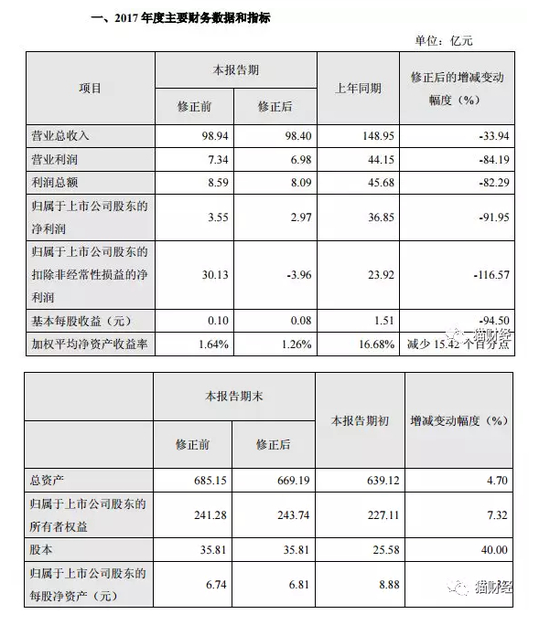 而在4月23日晚间,雅戈尔又发布了2017年业绩预告更正公告,预计2017年扣非后净利润与上年同期相比,将减少27.88亿元,同比降低116.57%左右。主要原因为公司将2017 年度计提中国中信股份有限公司资产减值准备33.08 亿元由非经常性损益调整至经常性损益。