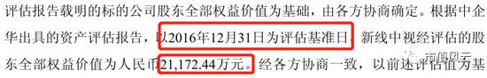 而此次由中企华出具的资产评估报告显示,新线中视的100%股权评估值则是2.1172亿元,见下方截图: