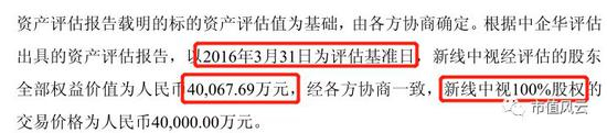 由评估公司中企华给出的评估报告显示,新线中视100%股权的评估值是4.0067亿元,见下方截图: