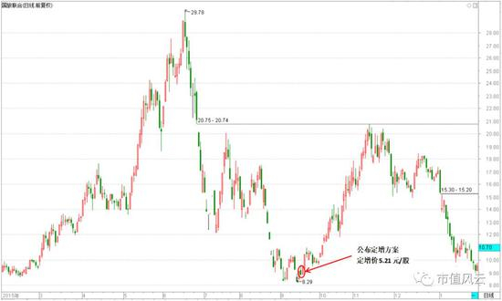 各位小伙伴们,注意哦,9月19日刚经历了2015年股灾2.0,此时国旅联合的股价相对阶段高点已经下跌近70%,收报在8.8元。按着5.21元的定增价,相当于打了40%的折扣,而这8.8元的价格无限接近定增方案公布日前后1年内的最低价。