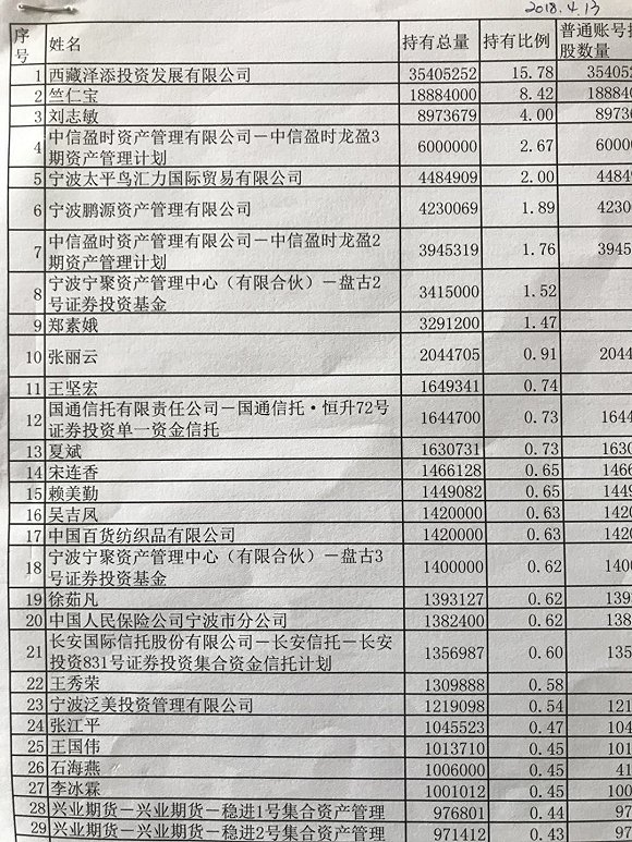 界面新闻记者独家得到了一份标记为4月13日的宁波中百股东表格。表格显示,除了公布的汇力贸易、鹏源资管、张江平,还有其他太平鸟相关疑似关联账户在要约收购之前就已持股。