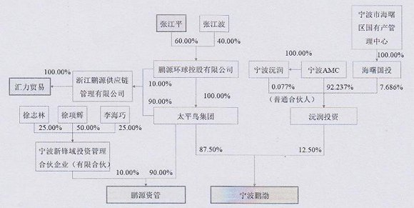 要约书摘要显示,在要约收购主体宁波鹏渤投资的股东结构中,宁波金控为代表的国资只占有12.5%的股份,而太平鸟方面却占有87.5%的股份,宁波金控在这场交易中的角色显而易见。