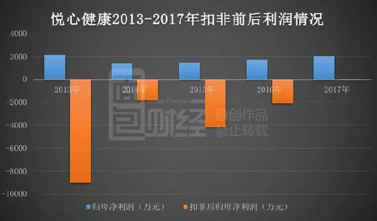 当我们观察一家企业的时候,要区分企业的利润到底是经营业务带来的,还是财务手法带来的。事实上,自2011至2017年,悦心健康扣非后归母净利润已连续7年为负,累计亏损金额约5.98亿元。来张图感受一下归母净利润与扣非净利润的差别: