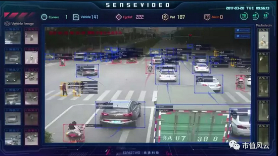 这张图片是商汤科技的动态监控界面的截图,从图中可以看到,这套监控软件可以实时分辨出画面中的汽车、行人、自行车等主体,并可以分辨人的性别,穿着,车的车型、颜色等信息。但是还不能具体识别每个行人的信息,其原因应该是摄像头的像素精度不足以支撑更详细的人脸识别。