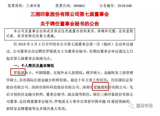 个性的董秘总是别具一格,5月4日晚间,三湘印象公告聘任罗筱溪为公司董秘,不知道三湘印象能给予罗筱溪多少薪酬。要知道罗筱溪刚在4月底从爱施德董秘任上离职,2017年爱施德给罗筱溪开出的薪酬是135万元,还是近三年最低的一次,而三湘印象2017年给董秘开出的薪酬则只有84万元,足足缩水了51万。