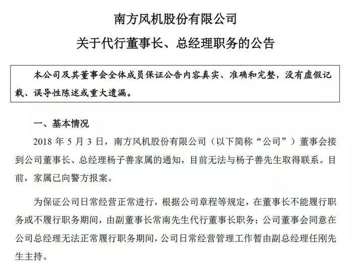 南风股份公告称,5月3日,公司董事会接到杨子善家属的通知,目前无法与杨子善先生取得联系,家属已向警方报案。