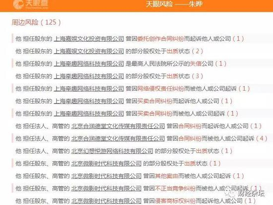 财经杂坛通过天眼查获悉,与朱晔有关联的公司72家,天眼查提供的风险提示多达125条。比如,朱晔他担任股东的 上海牵趣网络科技有限公司 是最高人民法院所公示的失信公司。