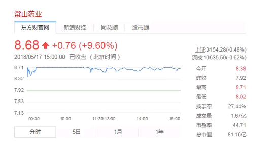 自该公告发布(5月15日晚)后,常山药业昨日开盘即封涨停,收获了今年以来的首个涨停,截至当天收盘报7.92元/股。今天早盘再一次高开高走,开盘8.38元/股,在9时44分到10时59分再次出现短暂涨停后,价格稍有回落,截至今日收盘报8.68元/股,总市值81.16亿元。