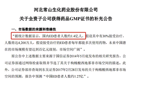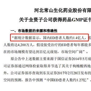 昨(5月16日)晚,常山药业关于子公司获得枸橼酸西地那非GMP证书发布了补充公告,表示其提到的“国内ED(勃起功能障碍)患者人数约1.4亿人”的数据来自于国信证券2014年5月底的相关研究报告,但并未对数据真实性进行核实。